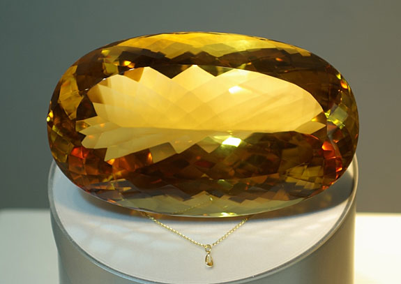The world's largest faceted citrine is an oval-cut (20 x 15 x 10 centimetres with weight 20,200 carats (that’s 8.8 pounds). It carries the name of the host city "Malaga" and is displayed in “Special Exhibition Gems” section of Art Natura in Spain.