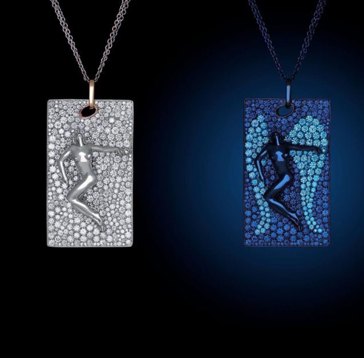 Some designers and jewellers are choosing to have fun with fluorescent diamonds. Designer, Maria Kovadi has creatively selected diamonds with blue fluorescence in her YouV diamonds collection to create angel wings in the pendant below, which can be seen when UV light is shone.