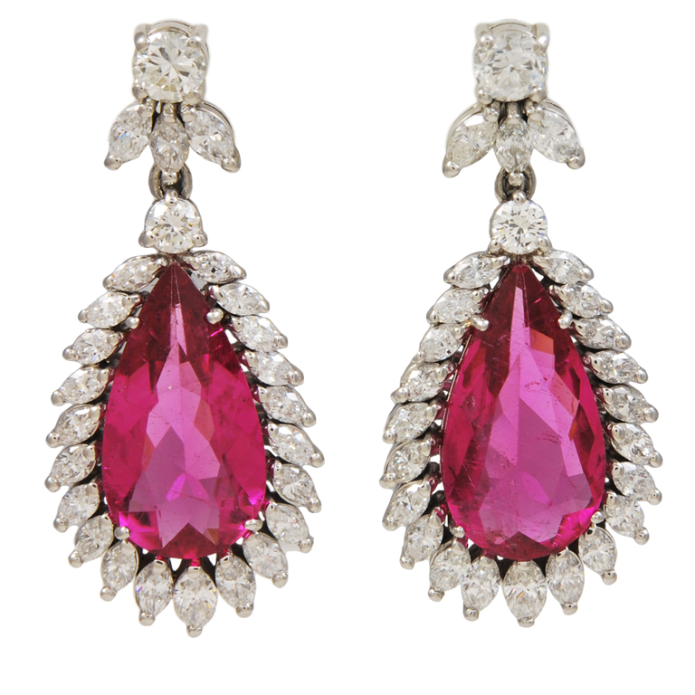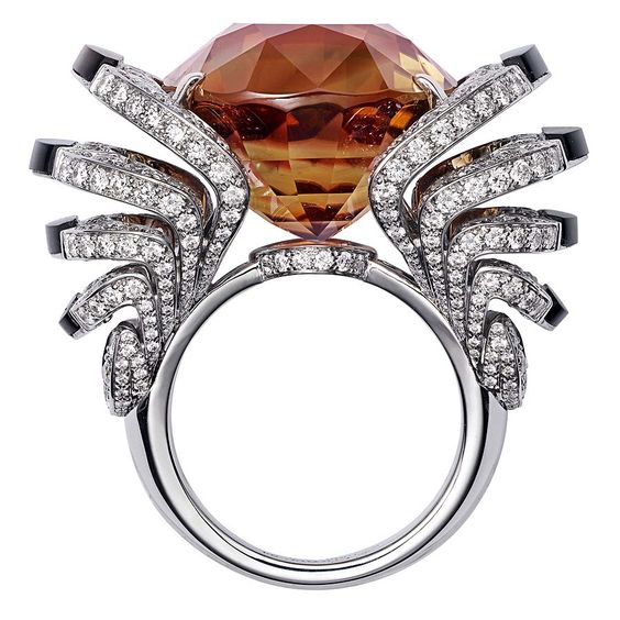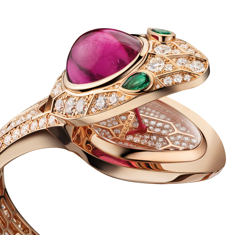 The Everlasting Light ring by Van Cleef & Arpels with a 10.62ct pear shape Tourmaline. A Cartier ring set with a 33.42 ct brown tourmaline. A pink cabochon tourmaline crown the Bulgari's serpenti cuff.